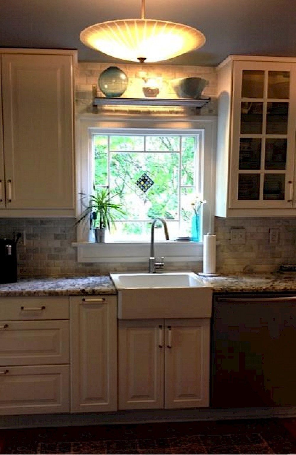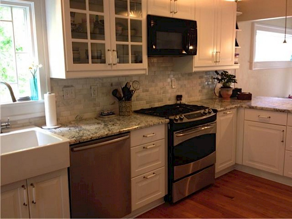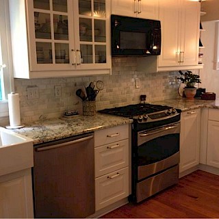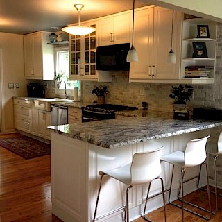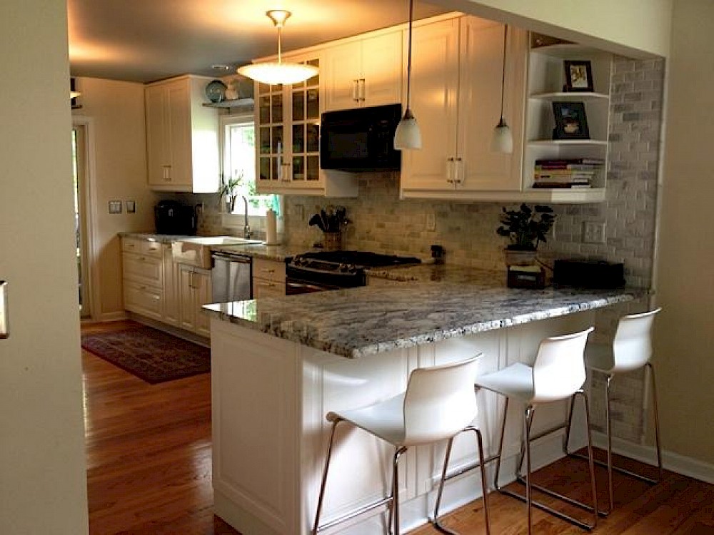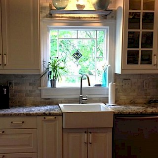 This kitchen in Ann Arbor was for a longtime client of Exemplar Carpentry. We started by moving all of the mechanicals in the room to accommodate the energy needs for the new appliance locations. We then created two new openings and windows and removed a load-bearing wall that was replaced with a beam. We installed and finished the hardwood floors creating a perfect match for the existing flooring. The framing was updated and drywall was hung and finished. The room was primed and painted with Sherwin-Williams products. The trim and a marble subway tiled backsplash was added to finish the project.